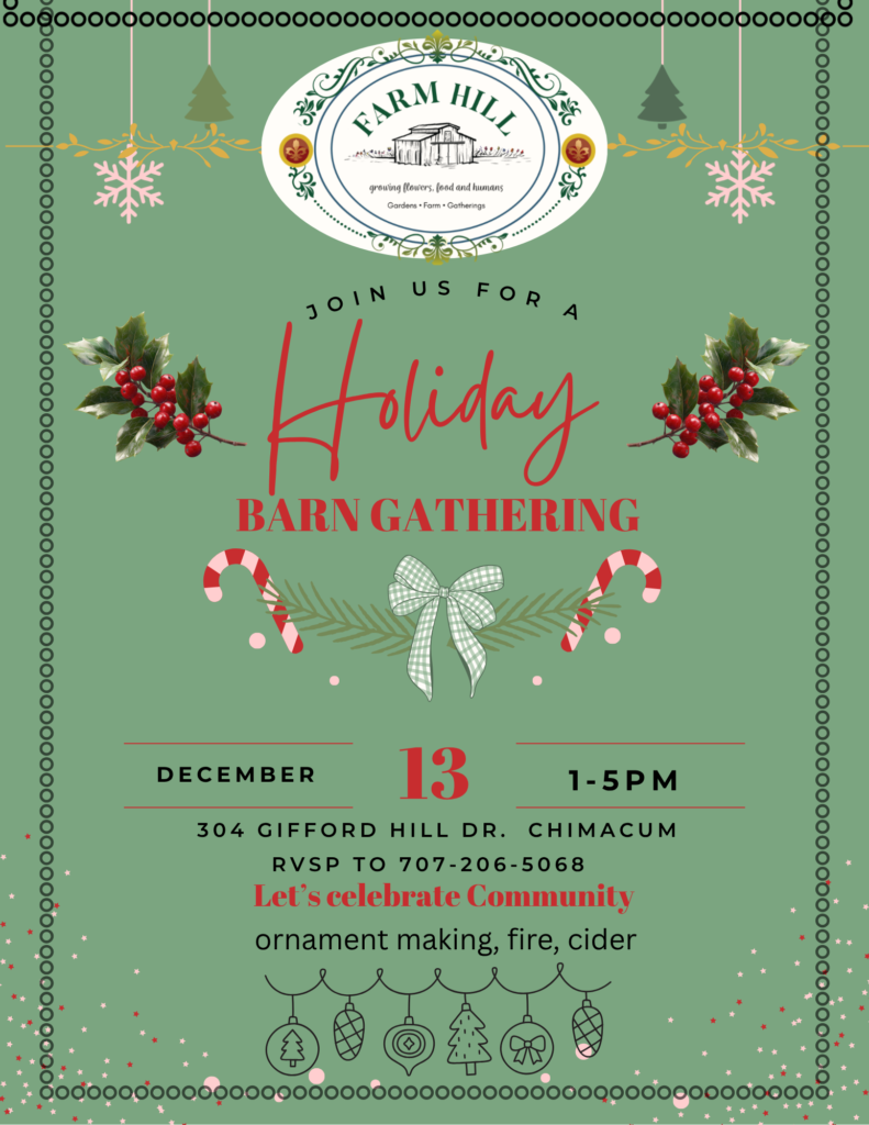 – Dec 13 we gather with a fire in the pit, cider, some simple crafts and talk more about the community oriented gatherings planned for 2026 at the Barn.